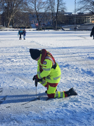 Bereits am Montag wurde durch die DLRG Neckar-Alb eine erste Messung der Eisdecke auf dem Anlagensee durchgeführt. Am heutigen Tag erfolgte eine erneute Überprüfung der Eisstärke im Auftrag der Ortspolizeibehörde Tübingen.
