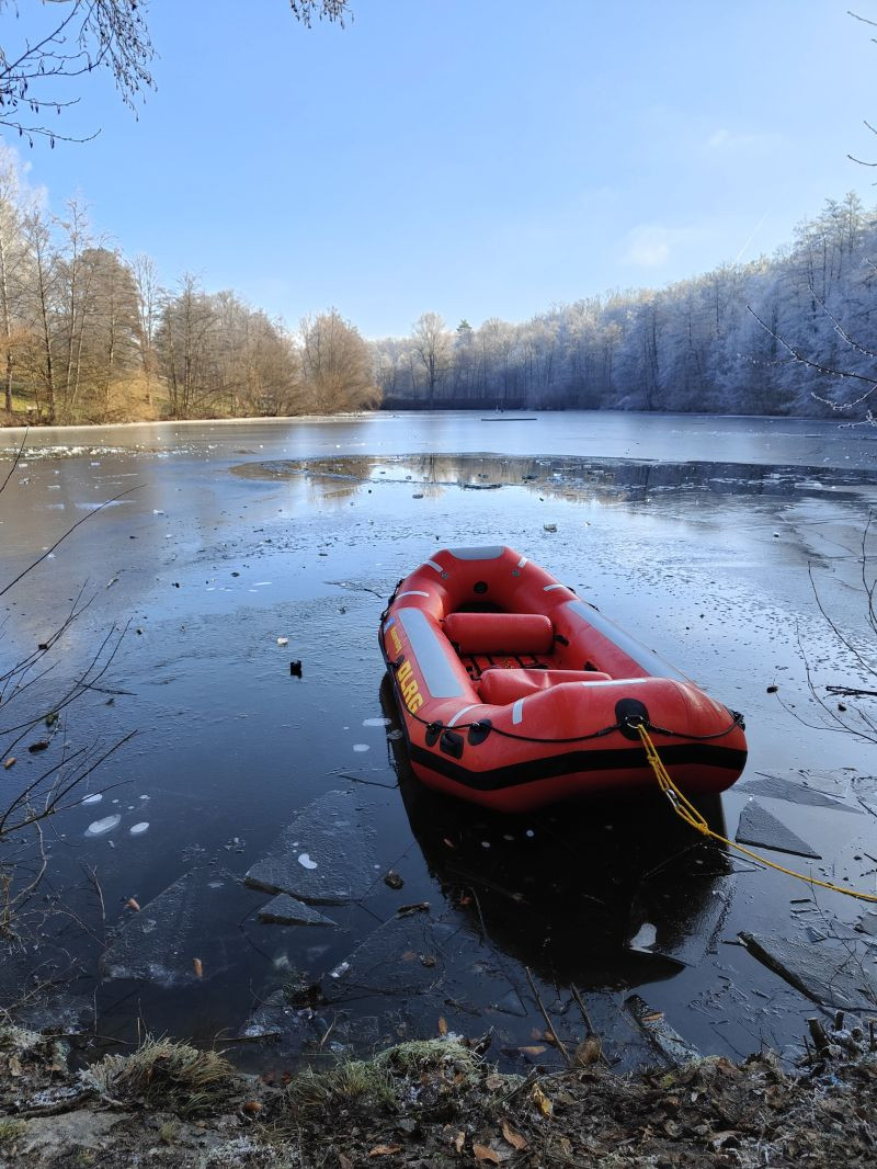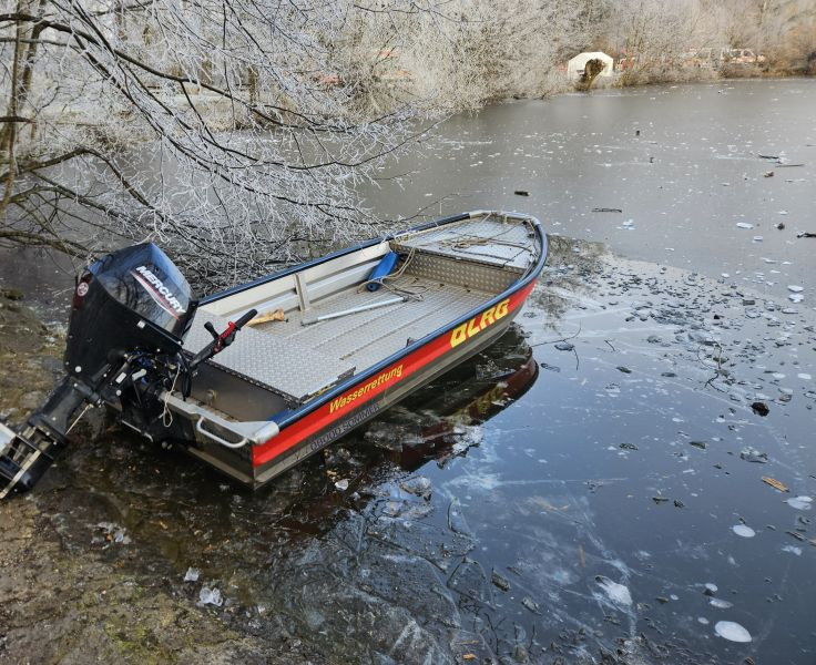 Auch bei freigegebenen Eisflächen gilt: Das Eis nicht alleine betreten. Dunkle Stellen im Eis, starker Pflanzenwuchs sowie hörbares Knacken oder Knistern sind Anzeichen für eine verminderte Tragfähigkeit. In solchen Fällen sollte die Eisfläche umgehend verlassen werden, möglichst flach liegend, um das Gewicht zu verteilen, und vorsichtig in Bauchlage in Richtung Ufer.